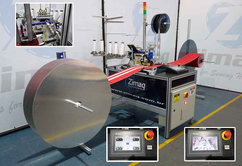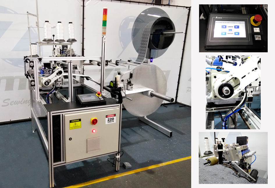 Modelo totalmente automático para bordado em 3 modelos diferentes, ajustáveis no painel, para faixas laterais do colchão. Conta ainda com enrolador automático, sensores de quebra de linha e fim de tecido, e indicador de quantidade de linha na carretilha.